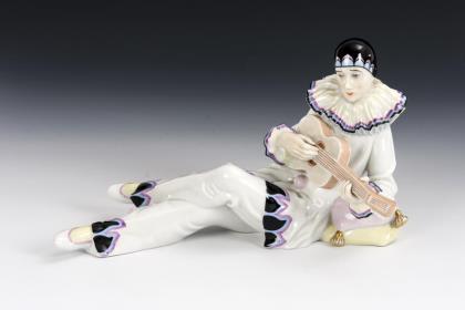 Liegender, eine Gitarre spielender Harlekin