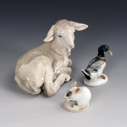 3x gemarkt Royal Copenhagen: Hahn (H 18,5 cm), liegendes Bärenjunges (L 11,5 cm), liegendes Rehböckchen (H 9 cm). / 1x gemarkt Bing & Gröndahl: stehendes Rehkitz (H 17,5 cm)