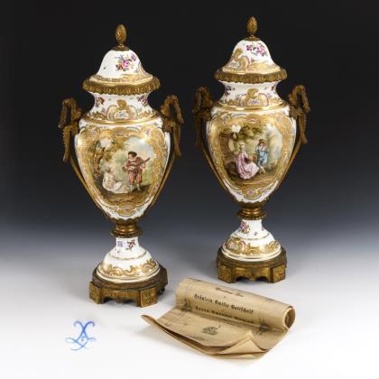 Ovoider Korpus mit bronzemontierten, floralen Handhaben, Rand, Knaufdeckel und Stand. Reiche Rocaillereliefmalerei und Blumenmalerei, schauseitig jeweils eine Watteau-Szene, verso jeweils eine Seelandschaft
