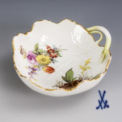 Vierpassige Durchbruchschale mit Blütenbelag und Blumenmalerei, zwei an einem Rocailleschaft stehende Putten, Rocaillefuß