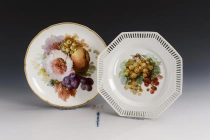 1x oktogonaler Teller mit stabdurchbrochener Fahne und Johannisbeeren im Spiegel. / 1x mehrpassiger Teller mit einem Frucht- und Blumenbukett mit Mohn, Trauben, Apfel und Johannisbeeren im Spiegel
