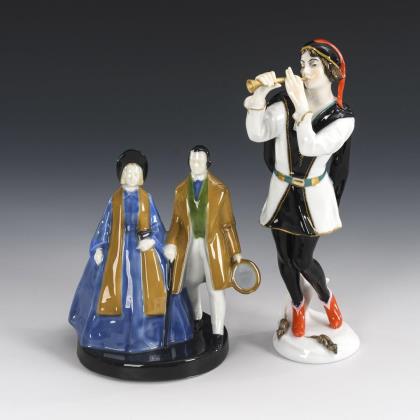 1x Heubach, Quadratmarke, ab 1909: Biedermeier-Paar beim Kirchgang (H 15 cm). / 1x ENS, Modell-Nr. 5931, um 1930: Art-déco-Figur des Rattenfängers zu Hameln (H 23 cm)