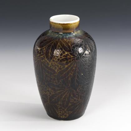 Balustervase mit braun-schwarzer Laufglasur sowie umlaufend geätzten Kastanienblättern
