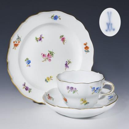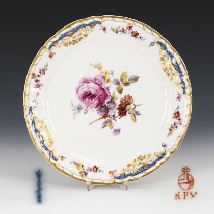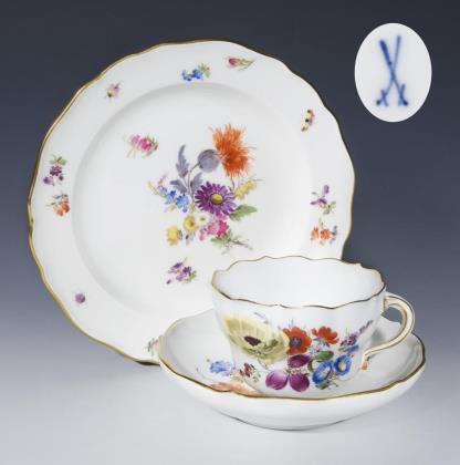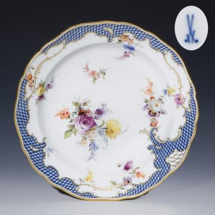Zarte farbige florale Bemalung mit Blütenfestons, Einzelblüten und Blumenbukett. Gold staffierter Mosaikrand mit Rocaillen- und Gitterornamenten, Goldrand. Form "Neuer Ausschnitt". Pressmarke, Schwertermarke