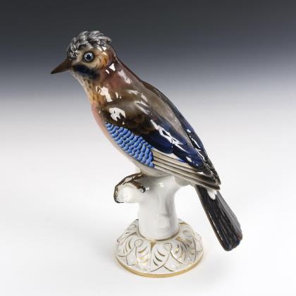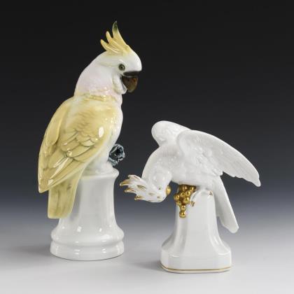 1x gemarkt Porzellanfabrik Günthersfeld, Modell-Nr. 6583: auf einem Sockel sitzender Kakadu mit Fruchtdolde (H 18,5 cm). / 1x gemarkt Gerold & C., Tettau, Modell-Nr. 12784: auf einem Säulensockel sitzender Kakadu