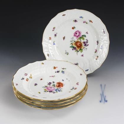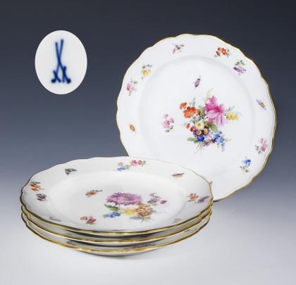 5 Teller mit Blumen- und Insektenmalerei. Meissen.