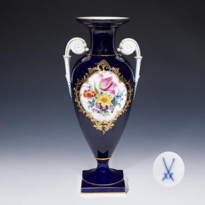 Amphorenvase mit kobaltblauem Fond. Meissen.