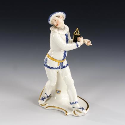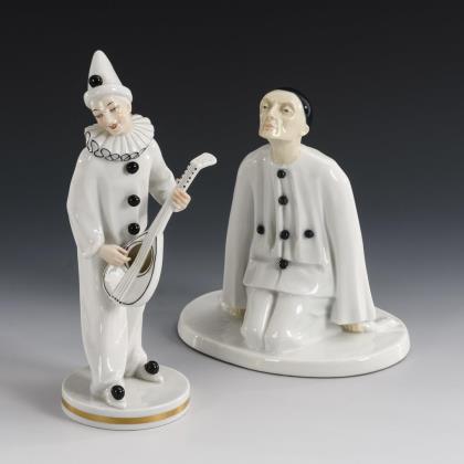 1x Fraureuth, ungemarkt, Entwurf von Carl Lorenz 1919, bezeichnet: Darstellung des Tänzers Harald Kreuzberg als kniender Pierrot (H 19 cm). / 1x Neapelmarke, 20. Jh., Modell-Nr. 12084: stehender Pierrot mit Gitarre (H 24 cm)