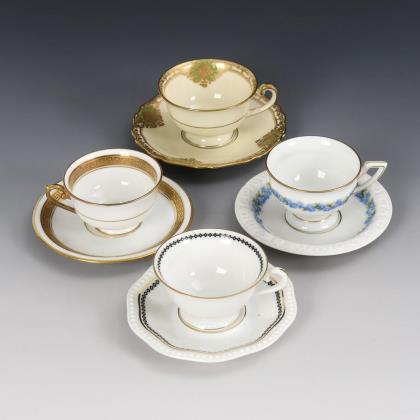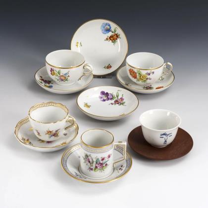 4 Tassen und 6 Untertassen Höchst mit Blumenmalerei sowie 1 weißes Koppchen mit Schwerterdekor in Unterglasurblau mit 1 Untertasse aus Böttger-Steinzeug