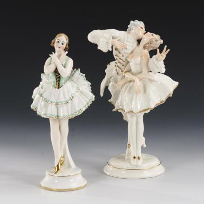 1x Hutschenreuther, ab 1955, Entwurf Karl Tutter (1883-1969): Plastik "Liebesschwur" (H 23 cm). / 1x gemarkt Tettau, um 1930: Art-déco-Plastik einer Ballerina (H 22 cm)