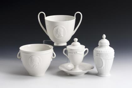 52 Teile. Empireform mit Schwanenhalshenkeln. Kaffeekanne (H 31 cm), Milchkännchen, 2 verschiedene Zuckerdosen (H 12,5 cm), 14 Tassen (H 8 cm), 16 Untertassen, 3 Gebäckteller (Ø 15,5 cm), 14 Frühstücksteller und 1 Durchbruchteller (Ø 29 cm)