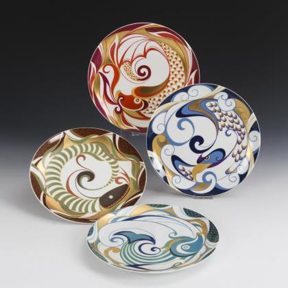 Wandteller mit farbigem, goldstaffiertem ornamentalen Dekor, davon 1 Teller mit Fischmotiv (= Element Wasser), 1 Teller mit Drachenmotiv (= Element Feuer), 1 Teller mit Adlermotiv (= Element Luft) und 1 Teller mit Schlangenmotiv (= Element Erde)