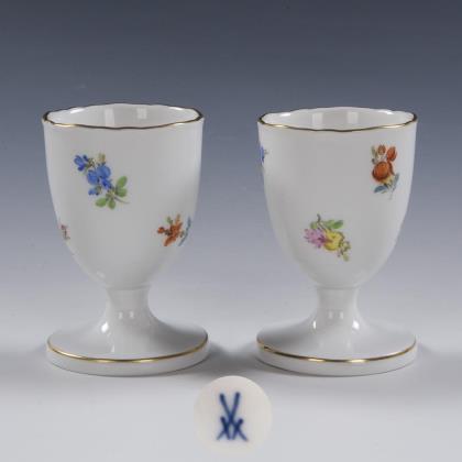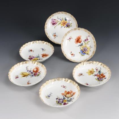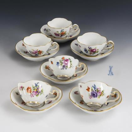 6 Vierpasstassen mit Blumen- und Insektenmalerei. Meissen.