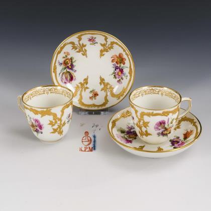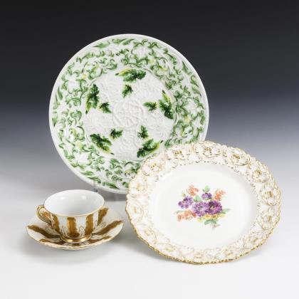 Teller mit floral-ornamentalem Relief (Ø 22 cm), Teller mit Rocaillerelief und Blumenmalerei (Ø 20 cm) sowie Mokkatasse (H 5 cm) und Untertasse (Ø 12,5 cm) mit teils goldbronziertem Blattrelief