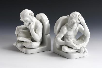 2 Buchstützen mit je einem lesenden Affen in nachdenklicher Pose