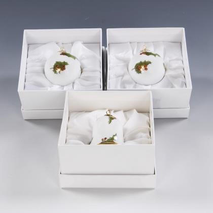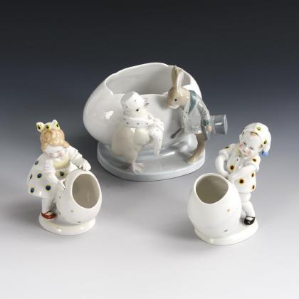 2x gemarkt Katzhütte: Mädchen bzw. Junge an einer Ei-Vase stehend (H je 12 cm). / 1x gemarkt Metzler & Ortloff, Modell-Nr. 2478/3: vor einer Ei-Vase stehende Figuren eines Kükens mit Pelzmütze und Muff sowie eines Hasen mit Zylinder (H 13 cm)
