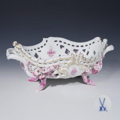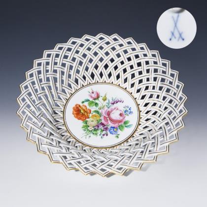 Modell von Carl Gotthelf Habenicht und Mitarbeiter 1837-1840. Farbige Blumenbemalung, Goldstaffage. Flächendeckend durchbrochen gearbeitete Wandung mit gezacktem Rand. Ritzmarke, Pressmarke, Schwertermarke