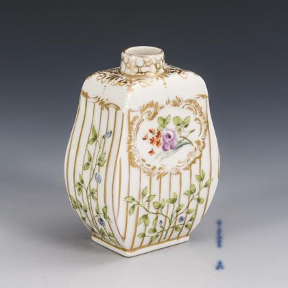 Modell von Johann Daniel Schöne 1818. Frontal passig geschweifte Goldreserve mit farbig gemaltem Blumenbukett, Goldstaffage. Montierter Standfuß. Pressmarken, Malermarke, Schwertermarke