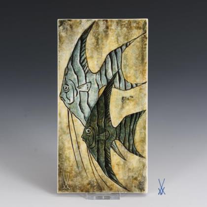 Rechteckige Platte mit dem farbig staffierten Relief zweier Fische