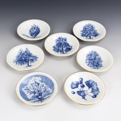 Kleine Teller mit verschiedenen Baummotiven, verso die Aufschrift "Kuratorium Baum des Jahres" mit Datierung und Bezeichnung des dargestellten Baumes