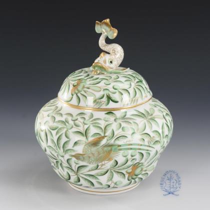Gedrückte Balusterdose mit einem Delfin als Deckelknauf. Umlaufend bemalt mit Blattwerk und 2 in den Blättern sitzenden Vögeln