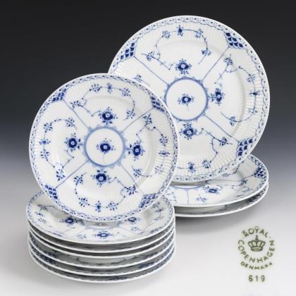 7 + 3 Teller "Musselmalet Halbspitze". Royal Copenhagen.