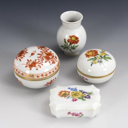 3 Dosen und kleine Vase mit Blumenmalerei. Meissen.