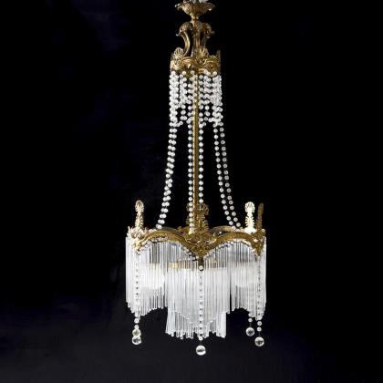 4-flammige Deckenlampe mit Bronzegestell in klassizistischer Formensprache und üppigem Glasstabbehang, verziert mit Glasketten