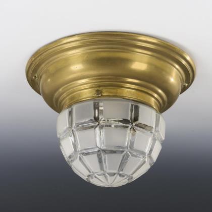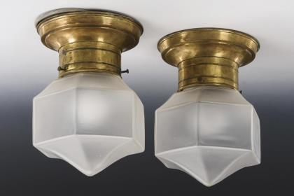2 Plafonniers mit zylindrischem Messingkorpus, Messingring und polygonalem Glasschirm