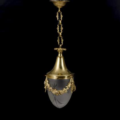1-flammige Hängelampe mit glockenförmigem Messinggestell und reliefierten Festons an Kettenaufhängung mit Rosettenbaldachin; ovaler Glasschirm mit Kerbschliffdekor