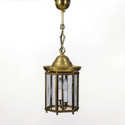 2-flammige Deckenlaterne mit 6-eckigem Korpus mit Glockenhaube, an Kettenaufhängung mit Glockenbaldachin