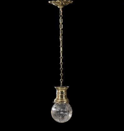 1-flammige Hängelampe an Kettenaufhängung mit Akanthusblattbaldachin, Zylinderfassung mit Girlanden-Dekor und Kugelschirm mit Schliff- und Kerbdekor