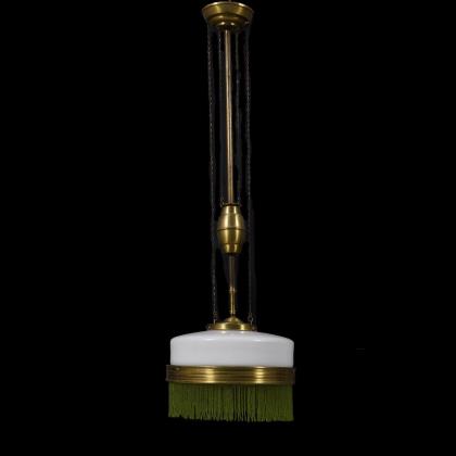 1-flammige, höhenverstellbare Hängelampe mit Mittelstab und Tellerbaldachin, Glasschirm mit Messingring und grünem Perlbehang; individuell höhenverstellbar durch Doppelzug-Pendel