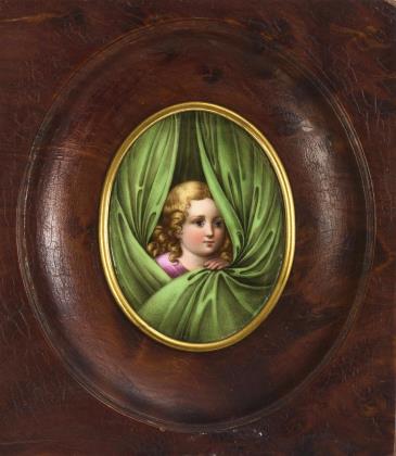 Ovale Bildplatte mit dem fein gemalten Bildnis eines Mädchens, aus einem grünen Vorhang hervorschauend. Bildplatte