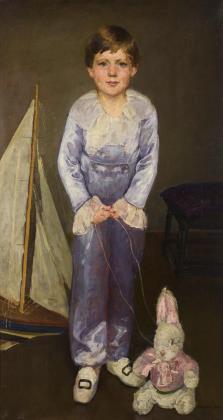 Ganzkörperbildnis eines Jungen im Kostüm mit einem weißen Stoffhasen und einem Segelschiff