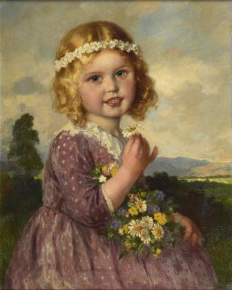 Sehr fein gemaltes Halbbildnis. Bei allem kindlichen Liebreiz erkennt man den spezifischen Charakter der kleinen Person. Originaler Keilrahmen, originaler breiter, aufwendig gearbeiteter Goldrahmen mit altem Klebezettel von Franz Bessler, Rahmenfabrik und Kunsthandlung in Augsburg