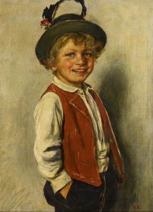 Fröhlicher blondgelockter Knabe mit Händen in den Taschen sowie keck aufgesetztem Federhut und roter Weste