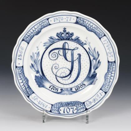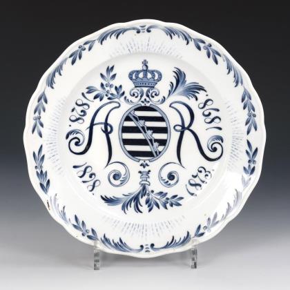Form "Neuer Ausschnitt". Mit dem unterglasurblau gemalten, von den Initialen "A" und "R" sowie den Jahreszahlen "1828 / 1898 / 1873 / 1898" flankierten sächsischen Wappen