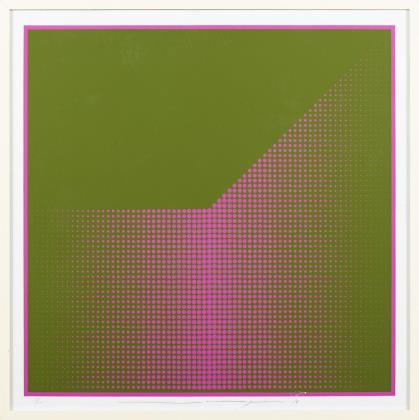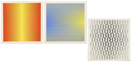 2 Op-Art-Werke Getulio Alviani: Gelb-Blau-gestreift, Blatt: 49,5 x 50 cm | Gelb-Rot-gestreift, Blatt: 51 x 50 cm | 1 Op-Art-Werk H. Andree ?, Blatt: 59,5 x 59,5 cm, oberer Rand knickspurig