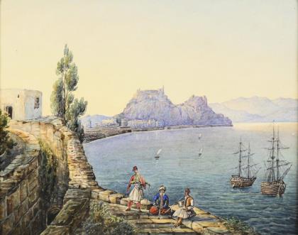 Blick von der Terrasse mit Staffagefiguren über die Bucht mit Segelschiffen zu den Festungen