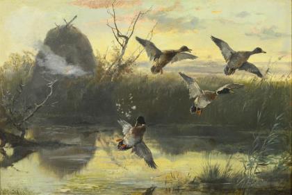 GRÄBHEIN, Wilhelm (1859 Bienstädt - 1931 München). Jagdbild: Enten am Weiher.