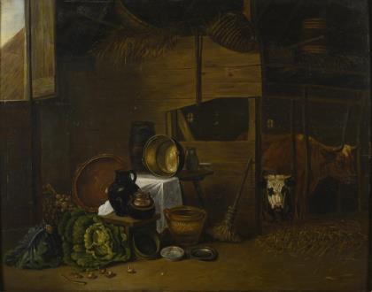 Kanne, Kessel und andere Gefäße neben Kohl und Zwiebeln im Stall nahe den beiden Rindern