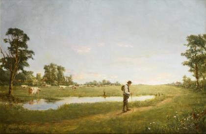 Wanderer an einem Teich neben einer Weide mit Rindern an einem Sommertag