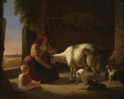 Die Mutter beim Füttern der Ziege mit den kleinen Zicklein und dem Kind im warmen Licht
