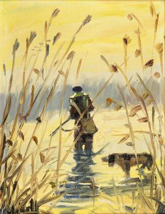 In den Abendhimmel auffliegende Enten über dem Weiher; davon eine getroffen von dem Schuss aus dem Heudiemen