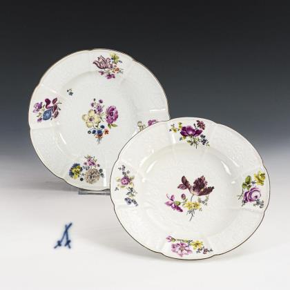 Mehrpassige Speiseteller mit verschiedenem Floralreliefdekor und Blumenbuketts
