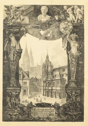 Blick auf den Kölner Dom mit Vorplatz durch üppig verzierte Rahmung und Gedicht von Heinrich Heine "Im Rhein, im schönen Strome, Da spiegelt sich in den Welln, Mit seinem großen Dome, Das große, heilge Köln.", verso Bleistiftvermerk "Platte nach 2. Weltkrieg gefunden"