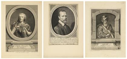 Bause, Johann Friedrich: Porträt des osmanischen Diplomaten Achmet Effendi (1694-1783), bezeichnet "Türkischer Botschafter am K. Hofe zu Berlin", Platte: 23,7 x 17,5 cm, Blatt: 31,5 x 23 cm, griffspurig, stockfleckig, Riss am rechten Rand, Rand mit Bleistiftnotizen | Delff, Willem Jacobszoon: Porträt des Dichters Johannes Stalpaert van der Wiele (1579 - 1630), Blatt: 31 x 22 cm, griffspurig, etwas stockfleckig | Daullé, Jean: Porträt des Feldmarschalls Karl Alexander von Lothringen (1712 - 1780), bezeichnet "Charles Alexander de Lorraine", Platte: 28,5 x 19 cm, Blatt: 32 x 22,5 cm, griffspurig, minimal stockfleckig