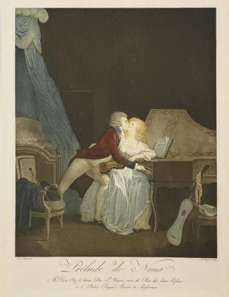 Erotische Genreszene mit innig umschlungenem Paar, an einem Flügel sitzend, bezeichnet "Prélude de Nina. A Paris, Chez l'Auteur Rue St. Honoré, entre la Rue des bons Enfans et le Palais Royal Maison du Parfumeur", nach einem Gemälde von Louis Boilly (1761 - 1845)