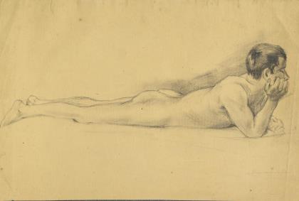 Darstellung eines jungen, auf dem Bauch liegenden männlichen Aktes